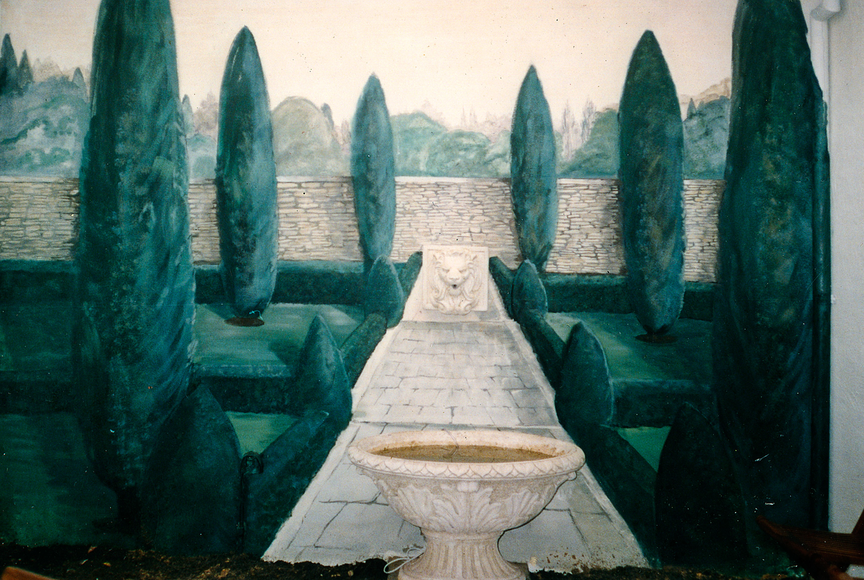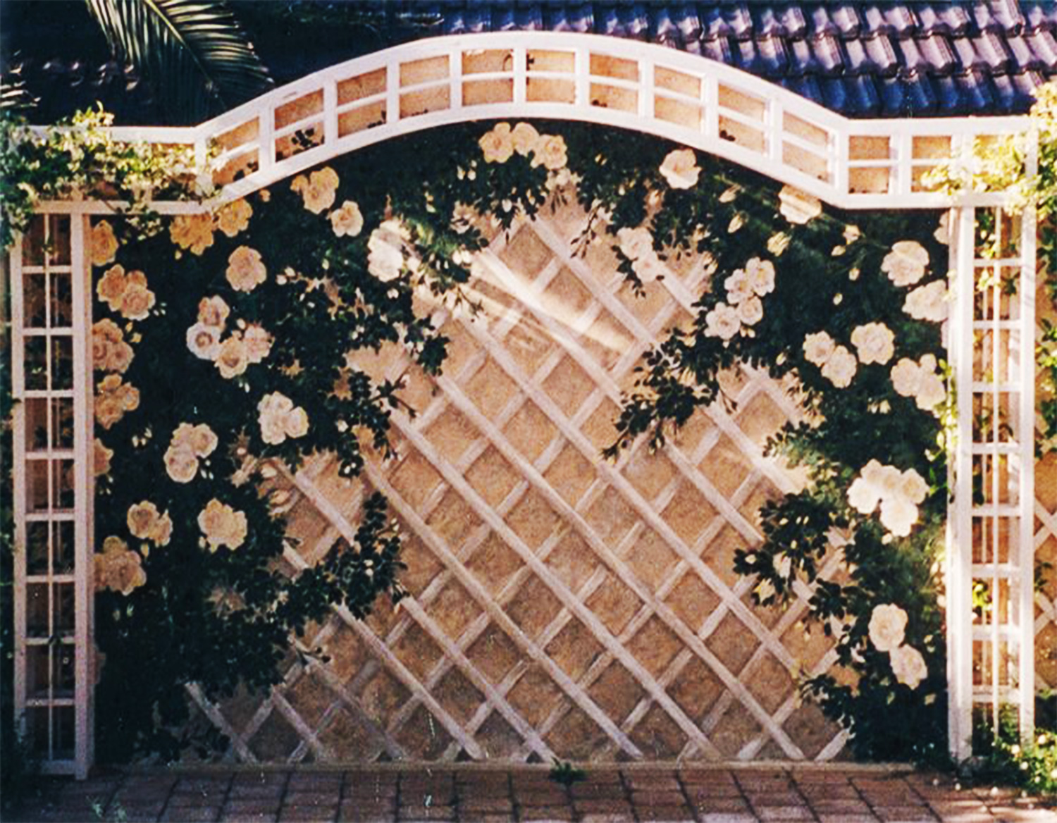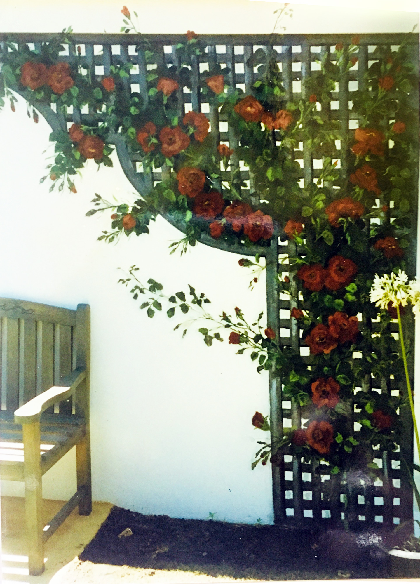 What I really loved painting were murals in homes, restaurants and especially gardens. A garden could be enhanced or extended by painting a trompe L’oeil on a wall, that “tricks the eye” that gives an illusion of distance, or a year around vista of flowering climbing rose rambling over lattice or wrought iron that I would design and paint onto the wall.